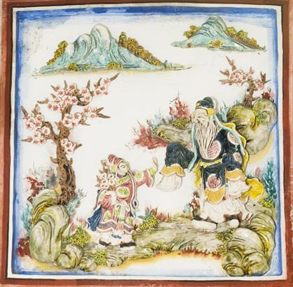 欞星門屋脊中央安置麒麟負日之裝飾,以彩色瓷片及灰泥塑成。